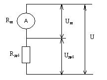 Рисунок 5.4 – Схема включения вольтметра Добавочный резистор Rдоб, включенный последовательно с рамкой измерительного механизма, ограничивает ток полного отклонения I, протекающего через нее, до допустимых значений. При этом падение напряжения на рамке UV зависит от сопротивления рамки RV и обычно не должно превышать десятков милливольт. Остальная часть измеряемого напряжения U должна падать на добавочном сопротивлении. Если необходимо получить верхний предел измерения напряжения, в m раз превышающий значение UV, то необходимо включить добавочный резистор, сопротивление которого легко вычисляется по формуле Rдоб = RV (m – 1). Добавочные резисторы изготавливают из термостабильных материалов, например, из манганиновой проволоки. Они могут быть внутренними, встроенными в корпус прибора (при напряжениях до 600 В), и наружными (при напряжениях 600-1500 В).