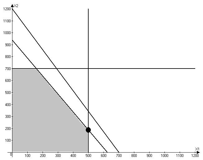 Стрелками показано размещение допустимых решений относительно линии, которые удовлетворяют ограничение (т.е. показаны допустимые полупространства). Закрашенная область графика показывает область допустимых решений. На графике точка А - угловая точка. Ее нашли построив функцию Z, взяв ее значение равным 84000, определив направление данной прямой и параллельно сместив ее в направлении, показанном стрелкой смогли определить угловую точку которая является оптимальным решением.
