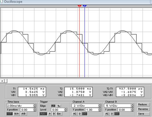 Используя полученную осциллограмму, проводим визуальную оценку точности воспроизведения аналогового сигнала из цифрового, поступающего от АЦП и определяем среднее значение ошибки восстановления σ.