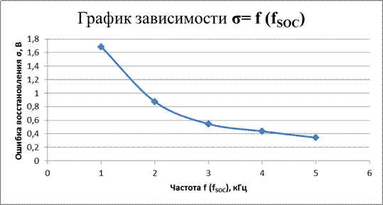 Рис. 3. График зависимости σ= f (fSOC) Далее, согласно требованиям, включим логический анализатор и проследим за цифровой информацией, поступающей на его входы с аналого-цифрового преобразователя. Оценим длительность элемента в кодовых словах, представленных на логическом анализаторе, и взаимосвязь между частотой дискретизации (периодом дискретизации) и длительностью элемента кодовых слов.