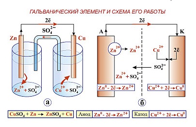 Протекание тока внутри элемента будет происходить от отрицательного заряда к положительному, то есть от цинковой пластины к медной. Движение заряженных частиц по внешней цепи будет осуществляться в обратном направлении. При воздействии электрического тока движение остатков серной кислоты, а также ионов водорода будет происходить в различных направлениях. При этом водород передает заряд на медную пластину, а остаток кислоты – на цинковую пластину. Таким образом, на клеммах будет осуществляться поддержка напряжения. Одновременно, на медной пластине оседают пузырьки водорода, ослабляющего общее действие элемента и создающего дополнительное напряжение. Такое напряжение известно, как электродвижущая сила поляризации. Чтобы избежать этого явления, в состав вводится вещество, способное поглощать атомы водорода и выполнять функцию деполяризации. Таким образом, в основу работы гальванического элемента положено явление электролиза. Электролиз - это совокупность химических процессов, происходящих в электролите при прохождении через него постоянного электрического тока, когда положительно заряженные ионы движутся к катоду, а отрицательно заряженные – к аноду. Из теории известно, что для выработки напряжения необходимы 3 вещи: один электролит и два различных электрода. В качестве электролита в домашних условиях может выступать любой органический продукт, содержащий жидкость. Электродами могут служить любые металлические предметы из различных металлов. В самодельном гальваническом элементе цинковая пластина действует как отрицательный электрод, а медная пластина – как положительный. Электролитом является сок фруктов и овощей. Тем самым фрукты и овощи являются биотопливом.