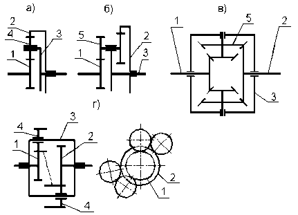 Как видно из приведенных примеров, планетарный ряд можно построить, используя только внутреннее зацепление (рис.3а), только внешнее зацепление (рис.3в и 4г), только конические передачи (рис.2 и 3в) или с использованием внутреннего и внешнего зацеплений (рис.3б, 4а, 4б).