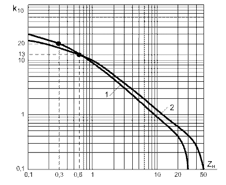 Кривая предельной кратности для трансформатора тока типа ТПП10-5-83-(81) приведена на рис. 2.12 для I 1ном=100 А при Z н ном=0,6 Ом, К 10ном=13 (кривая 1). Если, например, фактическая нагрузка Z н факт = 0,3 Ом, то можно по той же кривой определить, что кратность тока при сохранении погрешности 10% может быть равна 20. Номер кривой определяется значением I 1ном, как это видно из таблицы под кривой.