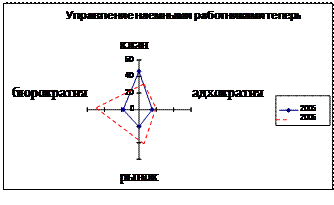 Рисунок 2.10 - Частный профиль «Управление наемными работниками» за 2005, 2006 года Существующие графики позволяют выделить наиболее выраженные тенденции изменения культуры за три года. В 2005 году квадрант «Клана» полностью доминировал над всеми остальными квадрантами. Ситуация изменилась в 2006, где помимо квадранта «Клан» в лидеры вышел квадрант «Иерархия». Остальные два квадранта остались на тех же позициях, что и в 2005 году. 2006 год ознаменовался тем, что одним из доминирующих квадрантов стал «Рынок». Получилась следующая картина. В 2005 году доминирующим квадрантом был «Клана». Затем, в 2006 а «Клану» присоединился квадрант «Иерархии». В 2006 году получилась ситуация, где уже три квадранта «Клан», «Иерархия» и «Рынок» стали лидерами. Причем, квадрант «Клана» со временем потерял свои позиции, а «Иерархия» и «Рынок» наоборот - росли.