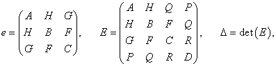 В качестве инвариантов используются ранги матриц e и E, определитель матрицы E и знаки корней характеристического уравнения для матрицы e. Указанные матрицы имеют вид: