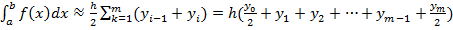 Ми дістали квадратурну формулу, замінивши функцію f (x) інтерполяційним многочленом першого степеня (лінійна інтерполяція), який в точках x = a і x = b набуває відповідно значень f (a) і f (b). Формула (6) називається квадратурною формулою трапецій. Узагальнена квадратурна формула трапецій. Якщо відрізок [ а; b ] великий, то й похибка формули (6) може бути великою. Щоб зменшити її, поділимо відрізок інтегрування [ а; b ] на m рівних частин: [ x 0; x 1], [ x 1; x 2],..., [ xm -1; xm ], завдовжки