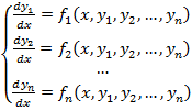 полягає у відшуканні функції y = y (x), яка задовольняє цьому рівнянню і початковій умові y (x 0)= y 0, (2) де x 0, y 0 – задані числа. Задача Коші для системи диференціальних рівнянь