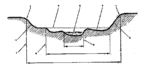 Рис.2 Элементы речной долины 1 - бровка; 2 и 3 - левый и правый склоны (борта) долины; 4 - пойма; 5 - уровень в половодье; 6 - уровень в межень; 7 - высота берега; 8 - ширина реки в половодье; 9 - ширина реки в межень