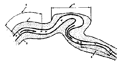 Рис.3 Повороты русла и долины реки 1 - извилина; 2 - границы долины; 3 - излучина; 4 - лука