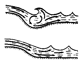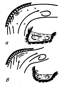 | Характерное препятствие для реки с быстрым течением - прижим. Он образуется в местах резких поворотов русла и происходит оттого, что река упирается в трудно размываемую породу (граниты, базальты) и поворачивает в сторону. При этом большая часть воды наваливается на препятствие. Вблизи места контакта воды с препятствием создаются сложные движения потока. Если водность реки значительна, а поворот довольно крут, у самого берега образуются отбойные валы. Распределение течений в прижиме в этом случае будет иметь вид, представленный на рис. 5б. При высокой водности рек, но менее крутых поворотах, а также при отрицательной крутизне берега под водой отбойный вал может не возникнуть. Тогда распределение течений будет иметь вид, приведенный, на рис. 5а. Аналогичная картина возникает в прижиме на достаточно крутом повороте в потоке с малым расходом воды.