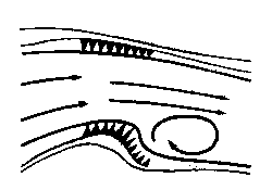 Подводные препятствия (крупные камни, резкие ступени), расположенные на участках с быстрым течением, могут служить источником возникновения водяных ям или бочек. Распределение течений в таком образовании показано на рис. 4.Если большой камень в русле реки торчит над водой, за ним образуется участок относительно спокойной воды, называемый суводью. Размер суводи зависит от размера камня и скорости водного потока, набегающего на камень. Поскольку в суводи образуется обратное течение, ниже по течению от боковых сторон камня проходят границы струй, идущих навстречу друг другу. - примечание автора веб-сайта. При больших скоростях движения воды может происходить подсос воздуха в струи и перемешивание его с водой. Такая смесь имеет меньшую суммарную удельную массу и хуже держит предметы на своей поверхности.