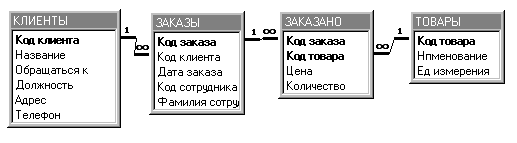 Вторая нормальная форма. О таблице говорят, что она находится во второй нормальной форме, если: · Она удовлетворяет условиям первой нормальной формы. · Любое неключевое поле однозначно идентифицируется полным набором ключевых полей. Из приведенного определения видно, что понятие 2НФ применимо только к таблицам, имеющим составной ключ. В нашем примере такой таблицей является Заказано, в которой составной ключ образуют поля Код Заказа и Код Товара. Данная таблица не является таблицей во 2НФ, т.к. поля Наименование, Единица измерения однозначно определяются только одним из ключевых полей – Код Товара. Для приведения таблицы ко 2НФ выделим из таблицы Заказано таблицу Товары, которая будет содержать информацию о товарах. Для связывания таблиц Заказано и Товары используется поле Код Товара