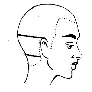 Боковые разделительные линии ВЗЗ определяются вертикальными границами височных зон, а нижний контур - горизонтальным пробором над ушными раковинами.