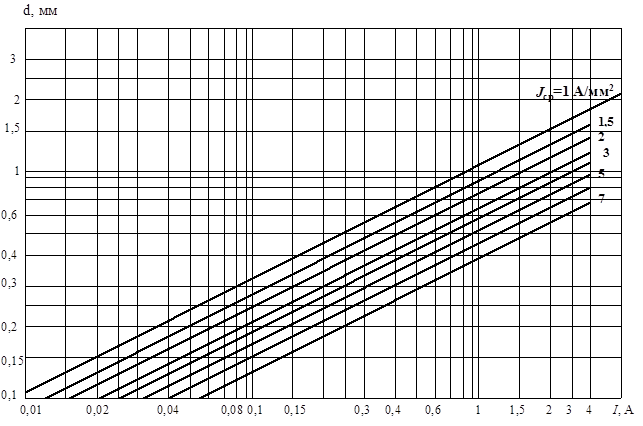 Рис. 7. Зависимость диаметра провода обмоток от тока I и средней плотности тока Jcp Диаметр проводов обмоток можно также определить расчетным путем: