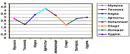 Познакомившись с этими "признаками опознания" таланта, вооружитесь карандашом и бумагой и оцените в баллах (от 2 до 5) каждый характерный признак во всех восьми описанных талантах. Если какая-то характеристика особенно подходит Вашему ребенку, ставьте ему 5 баллов, если она выражена только хорошо - 4 балла, ну и так далее (но не ставьте оценку ниже 2 баллов). Затем суммируйте баллы внутри каждой из восьми анкет на каждый тип таланта. Полученную сумму поделите на число признаков таланта (например, сумму полученную при сложении баллов за спортивный талант надо поделить на 8). Теперь построим график. Проведем оси координат. На горизонтальной оси 8 позиций (по числу видов таланта). На вертикальной оси нанесите через равные расстояния цифры от 2 до 5. На пересечении проекций средней оценки в баллах и вида таланта нанесите точку. Соединив полученные точки, вы получите нужный вам график.