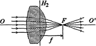 Тонкой называется линза, толщина которой намного меньше любого из ее радиусов кривизны. Оптическая система называется центрированной, если центры кривизны всех ее преломляющих поверхностей лежат на одной прямой, называемой главной оптической осью системы. Точка пересечения плоскости линзы с оптической осью называется оптическим центром тонкой линзы. Любая прямая, проходящая через оптический центр линзы и не совпадающая с главной оптической осью, называется побочной оптической осью. Если на собирающую линзу падают лучи, параллельные главной оптической оси, то они, после преломления в линзе, пересекаются в одной точке, лежащей на главной оптической оси и называемой главным фокусом линзы F (рис. 2). У линзы имеется два главных фокуса по обе стороны от нее. Расстояние f от оптического центра до фокуса называется фокусным расстоянием. Если радиусы кривизны поверхностей линзы одинаковы и с обеих сторон от линзы среда одна и та же, то фокусные расстояния линзы одинаковы.