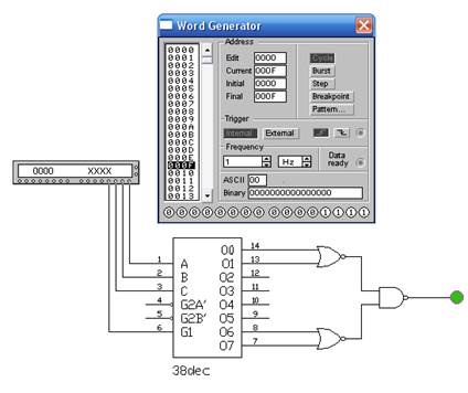 Задание 2. Исследование работы дешифратора в качестве демультиплексора выполните с использованием схемы, приведенной на рис. 3. В пошаговом режиме работы генератора слов передайте на входы А, В, С демультиплексора слова, эквивалентные числам от 0 до 7. Наблюдая при помощи логических пробников уровни сигналов на выходах, составьте таблицу функционирования. Убедитесь, что изменяющийся сигнал на входе G (5 Гц / 50 %) поочередно появляется на выходах дешифратора.