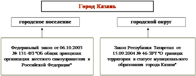 Город Казань в соответствии с Федеральным законом "Об общих принципах организации местного самоуправления в Российской Федерации" является городским поселением. Законом Республики Татарстан от 15.09.2004 N 46-ЗРТ "О границах территории и статусе муниципального образования города Казани" город Казань наделен статусом городского округа, органы местного самоуправления которого осуществляют полномочия по решению установленных вопросов местного значения городского округа, а также могут осуществлять отдельные государственные полномочия, передаваемые органам местного самоуправления федеральными законами и законами Республики Татарстан. Город Казань является столицей Республики Татарстан Полное официальное наименование города Казани – муниципальное образование город Казань Республики Татарстан. Сокращенное наименование – город Казань. Оба эти наименования используются в равных значениях. Территория города Казани состоит из 7 районов: - Авиастроительный район; - Вахитовский район; - Кировский район; - Московский район; - Ново-Савиновский район; - Приволжский район; - Советский район.