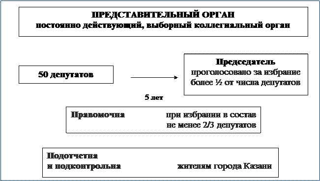 Казанская городская Дума (далее – Городская Дума) – постоянно действующий выборный коллегиальный представительный орган. Городская Дума подотчетна и подконтрольна жителям города. Городская Дума состоит из 50 депутатов, избираемых на муниципальных выборах сроком на 5 лет. 25 депутатов Городской Думы избираются по одномандатным избирательным округам, образуемым на основе средней нормы представительства избирателей на одномандатный избирательный округ. 25 депутатских мандатов распределяется между списками кандидатов, выдвинутыми избирательными объединениями. Полномочия депутата Городской Думы начинаются со дня его избрания и прекращаются со дня начала работы Городской Думы нового созыва. Днем начала работы Городской Думы нового созыва считается день проведения ее первого после выборов заседания. Депутат Городской Думы работает на непостоянной основе, совмещая депутатскую деятельность с выполнением трудовых и служебных обязанностей по месту основной работы, за исключением случаев, установленных настоящим Уставом. На постоянной основе в Городской Думе работают депутаты, избранные на выборные муниципальные должности Мэра города Казани, первого заместителя, заместителей Главы муниципального образования, секретаря Городской Думы. Городская Дума является правомочной при избрании в ее состав не менее 2/3 депутатов. Компетенция Городской Думы 1. В компетенции Городской Думы находятся следующие полномочия: -принятие Устава города и внесение в него изменении и дополнений; -утверждение бюджета города и отчета о его исполнении; -установление, изменение и отмена местных налогов и сборов, предоставление льгот по их уплате в соответствии с законодательством Российской Федерации о налогах и сборах; - принятие планов и программ развития города, утверждение отчетов об их исполнении; -определение порядка управления и распоряжения имуществом, находящимся в муниципальной собственности города; -определение порядка принятия решений о создании, реорганизации и ликвидации муниципальных предприятий и учреждений; -определение порядка участия города в организациях межмуниципального сотрудничества; -назначение даты выборов депутатов Городской Думы; -назначение членов Избирательной комиссии муниципального образования города Казани; -установление общеобязательных правил на территории города Казани в соответствии с законодательством; -установление официальных символов города Казани и порядка их официального использования; -исполняет иные полномочия в соответствии с Уставом города, Регламентом Городской Думы и иными правовыми актами Городской Думы. 2. Городская Дума по вопросам своей компетенции принимает решения, обязательные для соблюдения и (или) исполнения всеми юридическими лицами и жителями на территории города Казани. Основной формой работы Городской Думы является сессия, которая проводится не реже одного раза в три месяца. В период между сессиями деятельность Городской Думы осуществляется в форме заседаний Президиума, постоянных комиссий, депутатских объединений, фракций, временно созданных комиссий (в том числе выездных заседаний), дней депутата и других формах.
