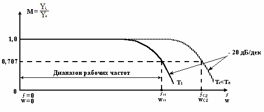 График АЧХ удобно изображать (для экспериментального определения параметров звена) в виде, показанном на рис. 2, где М – коэффициент частотных искажений.