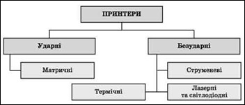 Комп'ютерний принтер (англ. printer — друкар) — пристрій для друку інформації на папері. Характеристиками є: - Принцип роботи друкуючого механізму; - Максимальний формат аркуша; - Підтримувана кольоровість друку; - Швидкість друку; - Роздільна здатність; - Ціна. Принтери, залежно від методів отримання зображення, розподіляють: