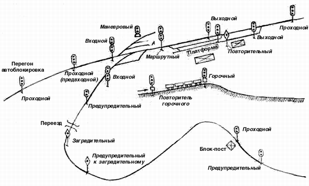 Безопасность движения и четкая организация движения поездов и маневровой работы требуют передачи машинисту информации, разрешающей или запрещающей движение, а при разрешении движения — о режиме ведения поезда. Кроме того, необходимы сообщения с локомотива работникам, связанным с движением поездов, о предполагаемых действиях машиниста. Передача всей совокупности необходимых приказов, указаний и извещений производится с помощью сигналов. На железнодорожном транспорте применяются только сигналы, утвержденные министром путей сообщения. Сигнал — это условный видимый или звуковой знак, при помощи которого подается определенный приказ. Сигнал является приказом и подлежит беспрекословному выполнению. Работники железнодорожного транспорта должны использовать все возможные средства для выполнения требования сигнала. Проезд закрытого светофора запрещается. Каждый сигнал несет одно определенное требование, поэтому для правильного приема сигналы должны возможно больше отличаться друг от друга физическими признаками. В качестве признаков, которыми отличают друг от друга видимые сигналы, используются цвет огней, их число и характер горения (мигающие или немигающие), окраска и положение сигнальных приборов. Видимые сигналы подаются светофорами, дисками, щитами, фонарями, флагами, сигнальными указателями и знаками. Звуковые сигналы отличаются числом и сочетанием входящих в них звуков различной продолжительности. Звуковые сигналы подаются свистками локомотивов, моторвагонных поез дов и дрезин, ручными свистками, духовыми рожками, сиренами, гудками и петардами. Видимые сигналы по времени их применения подразделяют на: дневные, подаваемые в светлое время суток; ночные, подаваемые в темное время суток; круглосуточные, подаваемые в светлое и темное время суток. В сигнализации, связанной с движением поездов, применяются следующие основные сигнальные цвета: зеленый, разрешающий движение с установленной скоростью; желтый, разрешающий движение и требующий уменьшения скорости; красный, требующий остановки. Число цветов, используемых в сигнализации для движения поездов, ограничено тремя перечисленными основными цветами, поскольку они обладают достаточной контрастностью, надежно различимы, способны как признак сочетаться с другими признаками, имеют большую дальность видимости при малом расходе энергии, сравнительно дешевы и технически просто выполняются. Помимо трех основных цветов, применяются также огни синего и белого (лунно-белого, прозрачно-белого, молочно-белого) цветов. Синий цвет хотя хорошо опознается, но обладает ограниченной дальностью видимости из-за малой прозрачности светофильтров. Белые огни близки по цвету посторонним источникам света, поэтому эти цвета имеют ограниченную область использования. Сигналы, установленные Инструкцией по сигнализации на железных дорогах СНГ, составляют несколько групп в зависимости от того, где и когда они применяются, т. е. от их основного назначения: постоянные сигналы — светофоры, применяемые при движении поездов и маневровой работе; сигналы ограждения, применяемые при ограждении мест, опасных для движения поездов (подаются дисками, щитами, фонарями, флагами, сигнальными указателями и знаками); ручные сигналы, применяемые работниками железных дорог при движении поез