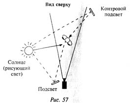 Вопрос: А если на фоне этого (сильно фильтруемого) неба снимается человек? Ведь его яркость также будет снижена? Ответ: В этом случае фигуру и лицо человека необходимо подсветить отражательным или электроцодсветом. Вывод: Когда в кадре присутствует человек, особенно на среднем и крупном планах, он непременно становится главным объектом. Яркости остальных элементов кадра оператор "увязывает" с яркостью лица человека. Интенсивность подсветки теней оператор определяет, исходя из яркости лица, неба и необходимого светового баланса. Что касается участков кадра, находящихся в глубокой тени и также "выпадающих" из фотографической широты матрицы (в нашем примере это тень под деревьями), то и здесь могут быть использованы отражательные подсветы или электросвет (5500К). Если нет возможности поднять яркость теневых участков кадра при помощи подсветов, эти участки - детали декорации, стволы деревьев и пр. - нередко окрашивают в более светлые тона. Как видим, даже очень к контрастные объекты "поддаются" операторским трудам и заботам художников. Разумеется, этот пример относится к съемке игрового фильма. В документальных работах иногда приходится отказываться от весьма выразительных, но слишком контрастных кадров. Лучи солнца создают светотеневой рисунок на лице (рисующий свет). Подсвет, находящийся возле камеры, смягчает тени, уменьшая контраст. Контровой подсвет, расположенный вне кадра, создает световой контур. Одна из возможных схем расположения отражательных