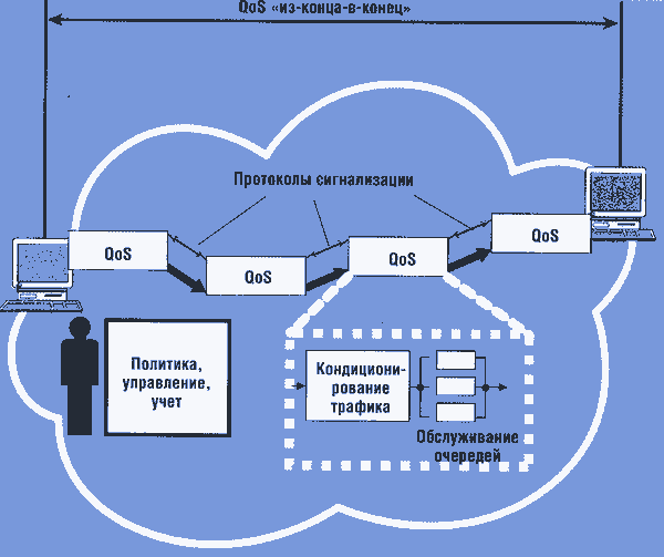 Служба QoS отвечает за обеспечение качества обслуживания для разных типов приложений. Она имеет распределенный характер, так как ее элементы должны присутствовать во всех сетевых устройствах, продвигающих пакеты: коммутаторах, маршрутизаторах, серверах доступа. С другой стороны, служба QoS должна включать также элементы централизованного управления, поскольку работу отдельных сетевых устройств, поддерживающих QoS, нужно координировать, чтобы качество обслуживания было однородным вдоль всего пути, по которому следуют пакеты потока. Любые гарантии QoS настолько хороши, насколько их обеспечивает наиболее "слабый" элемент в цепочке между отправителем и получателем. Поэтому поддержка QoS только в одном сетевом устройстве, пусть даже и магистральном, может весьма незначительно улучшить качество обслуживания или же совсем не влиять на параметры QoS.