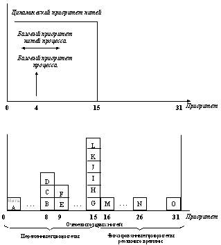 В отличие от Windows, в которой реализована многозадачность без вытеснения (non-preemptive multitasking), в Windows NT используется механизм многозадачности с вытеснением (preemptive multitasking). Windows NT поддерживает симметричную мультипроцессорную организацию вычислительного процесса, в соответствии с которой ОС может выполняться на любом свободном процессоре или на всех процессорах одновременно, разделяя память между ними. Так как многозадачность реализуется на уровне нитей, разные части одного и того же процесса могут действительно выполняться параллельно. Следовательно, многонитевые серверы могут одновременно обслуживать более одного клиента. Для того, чтобы прикладная программа могла использовать несколько нитей, не нужно предусматривать этого в ее алгоритме. Отдельная нить создается для каждой операции. Например, в одной нити программа может воспроизводить сложную графическую форму, а в другой - использоваться для редактирования объемного чертежа. Каждая из этих нитей (или, с точки зрения пользователя, операций) работает на отдельном процессоре, не требуя никаких управляющих вмешательств со стороны приложения. Нити внутри процесса используют общую область памяти и, следовательно, могут очень просто обмениваться данными. Для управления нитями Windows NT использует механизм приоритетов. В определенные моменты производятся оценка приоритетов и перераспределение нитей по процессорам, в результате чего последовательные стадии одной нити программы могут выполняться разными процессорами или откладываться до высвобождения очередного процессора. Каждой нити присваивается число - приоритет, и нити с более высоким приоритетом выполняются раньше нитей с меньшим приоритетом. В самом начале нить получает приоритет от процесса, который создает ее. В свою очередь и процесс получает приоритет в тот момент, когда его создает подсистема среды. Значение базового приоритета процесса присваивается ему системой по умолчанию или системным администратором. Нить наследует этот базовый приоритет и может изменить его, немного увеличив или уменьшив. На основании получившегося в результате приоритета, называемого приоритетом планирования, начинается выполнение нити. В ходе выполнения приоритет планирования может меняться. Windows NT поддерживает 32 уровня приоритетов, разделенных на два класса - класс реального времени и класс переменных приоритетов (рисунок 1.3). Нити реального времени, приоритеты которых находятся в диапазоне от 16 до 31, являются более приоритетными процессами и используются для выполнения задач, критичных ко времени. В Windows NT определено 4 класса приоритетов процессов: · IDLE_PRIORITY_CLASS - уровень 4 · NORMAL_PRIORITY_CLASS - уровень 9 при интерактивной работе процесса (forground) и уровень 7 при работе в фоновом режиме (background) · HIGH_PRIORITY_CLASS - уровень 13 · REALTIME_PRIORITY_CLASS - уровень 24 Большинство приложений либо не определяет класс приоритета процесса при его создании, либо устанавливает его в значение NORMAL_PRIORITY_CLASS. Класс IDLE - самый низкоприоритетный - хорошо использовать для работ, некритичных к скорости их выполнения, например, при наблюдении за состоянием системы или же при резервном копировании на ленту. Высокий приоритет (HIGH_PRIORITY_CLASS) следует использовать только тогда, когда это абсолютно необходимо, так как нити такого процесса будут выполняться всегда перед нитями процес