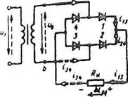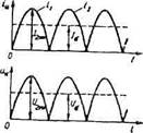 Рис2. Работу выпрямителя удобно рассматривать при помощи временных диаграмм. В первый полупериод, т.е. в интервале времени ОТ/2, диод закрыт, так как потенциал точки а выше потенциала точки Ь, под действием напряжения в цепи вторичной обмотки трансформатора возникает ток 1Н. В интервале времени t диод закрыт, ток в нагрузочном резисторе отсутствует, к запертому диоду прикладывают обратное напряжение Ui.
