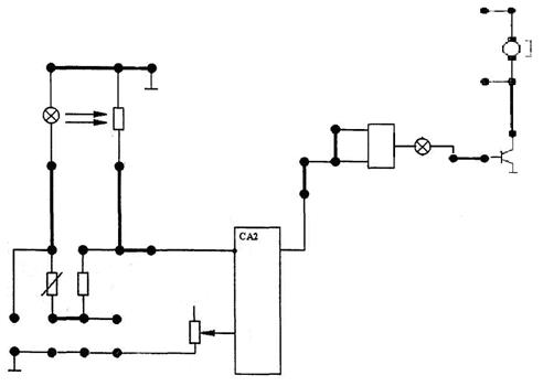 Вывод: Исследовав схему включения электродвигателя выходным сигналом фотодатчика при помощи переключающего усилителя, мы определили логический элемент (И-НЕ), и пришли к выводу, что данный логический элемент нельзя заменить для управления транзисторным ключом.
