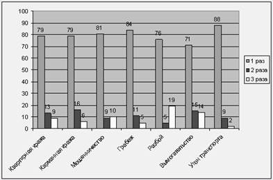 Рисунок 4 Вопрос: "Подвергались ли Вы лично за последние 12 месяцев перечисленным ниже преступным посягательствам? И если подвергались, то сколько раз?" (данные в % от числа подвергшихся преступным посягательствам определенного вида)