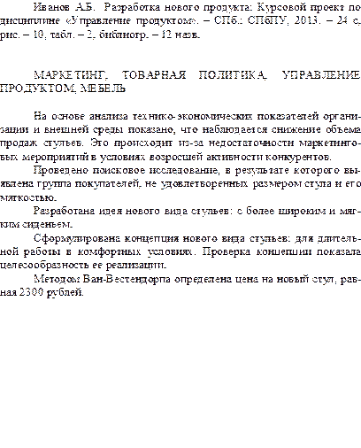 - Индексы не должны находиться на уровне основного текста. Неправильно: Используйте возможности MS Word (подстрочный режим написания). - Не используйте в пояснениях обозначения типа i-тый, i-ый. Правильные написания даны выше. Для данного случая правильно i-й. В формулах и таблицах обязательно указываются единицы измерения. Список использованных источников 1. Авилова Л. И. Развитие металлопроизводства в эпоху раннего металла (энеолит – поздний бронзовый век): состояние проблемы и перспективы исследований // Вестн. РФФИ. – 1997. – № 2. – URL: http://www.rfbr.ru/pics/ 22394ref/file.pdf. 2. Байгулов Р. М. Развитие научно-технического потенциала региона // Экономика с.-х. и перерабатывающих предприятий. – 2007. – № 3. – С. 13–15. 3. Бахрамов Ю.М., Глухов В.В. Финансовый менеджмент: учебник для вузов, 2-е изд. – СПб.: Питер. – 2011. – 496 с. 4. Вещунова Н.Л. Бухгалтерский учет в страховых организациях: учебно-практическое пособие. – М.: ТК Велби, Изд-во Проспект. – 2009. – 608 с. 5. Герман М. Ю. Модернизм: искусство первой половины XX века. СПб.: Азбука-классика. – 2003. – 480 с. 6. ГОСТ Р 2.105-95 ЕСКД. Общие требования к текстовым документам. // Помощь по ГОСТам. – URL: http://www.gosthelp.ru/text/GOST210595ESKDObshhietreb.html. 7. ГОСТ Р 7.0.11-2011 Диссертации. Структура и правила оформления. – URL: http://rfgost.ru/gost/371180/. 8. ГОСТ Р 7.0.5-2008 СИБИД. Библиографическая ссылка. Общие требования и правила составления. // Помощь по ГОСТам. – URL: http://www.gosthelp.ru/text/ GOSTR7052008SIBIDBibliogr.html. 9. ГОСТ Р 7.32-2001 СИБИД. Отчет о научно-исследовательской работе. Структура и правила оформления. // Помощь по ГОСТам. – URL: http://www.gosthelp.ru/gost/gost2737.html. 10. Гражданский кодекс Российской Федерации, часть первая от 30.11.1994 № 51-ФЗ. 11. Закон Санкт-Петербурга от 23.09.2009 № 420-79 «Об организации местного самоуправления в Санкт-Петербурге». 12. Конституция Российской Федерации. Принята 12 декабря 1993 г. с учетом поправок, внесенных Законом РФ о поправках в Конституцию РФ от 31.12.2008 № 6-ФКЗ, от 30.12.2008 №7-ФКЗ. 13. Лэтчфорд Е. У. С Белой армией в Сибири // Восточный фронт армии адмирала А. В. Колчака. – URL: http://east-front.narod.ru/ memo/latchford.htm. 14. Моделирование рынка: как спрогнозировать успех нового продукта / К. Дж. Кленси, и др.. – М.: Вершина. – 2007. – 272 с. 15. Нейман В. Г. Цисарь И. Ф. Компьютерное моделирование экономики. – М.: Диалог-МИФИ. – 2008. – 384 с. 16. Письмо ФНС России от 10.04.2012 № ЕД-4-3/512 «О налоге на добавленную стоимость». 17. Постановление Правительства Российской Федерации от 19.06. 2002 № 439 «Об утверждении форм и требований к оформлению документов, используемых при государственной регистрации юридических лиц, а также физических лиц в качестве индивидуальных предпринимателей». 18. Приказ Минфина Российской Федерации от 13.12.2020 № 167н «Об утверждении Положения по бухгалтерскому учету «Оценочные обязательства, условные обязательства и условные активы» (ПБУ 8/2010) (зарегистрирован в Минюсте Российской Федерации 03.02.2011 № 19691). 19. Указ Президента Российской Федерации от 04.08.2004 № 1009 «Об утверждении перечня стратегических предприятий и стратегических акционерных обществ». 20. Федеральный закон Российской Федерации от 08.08.2011 № 129-ФЗ «О государственной регистрации юридический лиц и индивидуальных предпринимателей». 21. Экономика и политика России и государств ближнего зарубежья: аналит. обзор, апр. 2007 / Рос. акад. наук, Ин-т мировой экономики и междунар. отношений. – М.: ИМЭМО. – 2007. – 39 с. 22. Zaltman G. How Customers Think: Essential Insights into the Mind of the Market. – Harvard Business School Press. – 2003. 