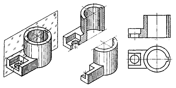 Через ось симметрии детали, внутреннее устройство которой нужно выявить, мысленно проводится секущая плоскость (рис. 9, а). Мысленно удаляется часть детали, находящаяся перед секущей плоскостью (рис. 9, б). Оставшаяся часть детали полностью проецируется на фронтальную плоскость проекций, штриховка наносится только на фигуре, лежащей в секущей плоскости. Разрез получен на месте главного вида (рис. 9, в).