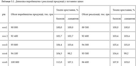 Для оцінки статистичних характеристик динамічного ряду виробництва або реалізації продукції розраховуються темпи росту і приросту (базисні і ланцюгові), а також середньорічні показники (середньорічний абсолютний приріст, середньорічні темпи росту і приросту). Таблиця 3.1