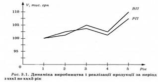 з таблиці видно, що за п'ять років обсяг виробництва зріс на 12 %, а обсяг реалізації - на 7,9 %. Якщо за попередні роки темпи зростання виробництва і реалізації приблизно збігалися, то за останній рік темпи зростання виробництва значно вищі від темпів реалізації продукції, що свідчить про нагромадження залишків нереалізованої продукції на складах підприємства і продукції, яку не оплатили покупці.