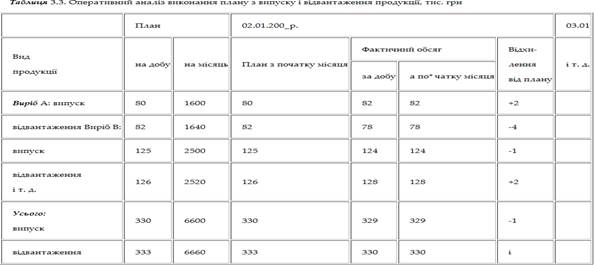 Оцінювання виконання плану з виробництва і реалізації продукції за звітний період (місяць, квартал, рік) проводять за методикою, наведеною в табл. Із таблиці видно, що за звітний рік план випуску готової продукції перевиконано на 5 %, а з реалізації - лише на 1,42 %, що також свідчить про зростання залишків нереалізованої продукції. Оперативний аналіз виробництва і відвантаження продукції виконують на основі розрахунків, в яких відображають планові і фактичні відомості про випуск і відвантаження продукції за обсягом і асортиментом, за якістю за день, за наростаючим підсумком з початку місяця, а також відображають відхилення від плану (табл. 3.3).