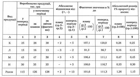 Водночас слід звернути увагу на те, що продукції Л у порівнянні з планом було виготовлено усього на 81,3%, а у порівнянні з попереднім періодом — на 86,7%. В результаті не додано продукції відповідно на 3 тис. грн і 2 тис. грн. Це вимагає ретельної перевірки причин зниження виробництва зазначеної продукції.