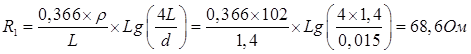 Общая электрическая мощность оборудования 675 Вт. Удельное сопротивление грунта Предельно допустимое электрическое сопротивление заземления при мощности оборудования менее 100 кВт и U ≤ 1000 В не должно превышать 10 Ом (R ≤ 100м). Естественное заземление отсутствует. Стержень заземления с общей длиной 2 м (в земле - часть длиной 1,4м) имеет диаметр 15 мм. 1. Сопротивление растекания току единичного заземлителя:
