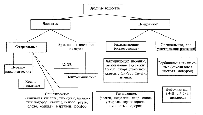 При проектировании оборудования возможны ошибки в устройстве тепловых компенсаторов, опор и креплений, в размещении трубопроводов на эстакадах, не учитываются особенности свойств транспортируемых газов. Так, опасность взрыва ацетилена напрямую зависит от диаметра и длины газопровода: увеличение размеров ацетиленопроводов может привести к взрыву. Если в трубопроводах с факельной установкой скорость газов окажется заниженной (или не предусмотрена система продувки оборудования инертным газом и поджигания горючего газа при внезапном сбросе его на факел), то произойдет загазованность воздушного бассейна и возможны несчастные случаи. Опасность АХОВ (СДЯВ) по заражению приземного слоя атмосферы определяется их физико-химическими свойствами, а также их способностью перейти в «поражающее состояние», то есть создать поражающую людей концентрацию, или снизить содержание кислорода в воздухе ниже допустимого уровня. Все АХОВ (СДЯВ) можно разделить на три группы, исходя из температуры их кипения при атмосферном давлении, критической температуры и температуры окружающей среды; агрегатного состояния АХОВ (СДЯВ); температуры хранения и рабочего давления в емкости. 1-я группа включает АХОВ (СДЯВ) с температурой кипения ниже -40°С. При выбросе этих веществ образуется только первичное газовое облако с вероятностью взрыва и пожара (водород, метан, угарный газ), а также резко снижается содержание кислорода в воздухе - особенно в закрытых помещениях (жидкий азот). При разрушении единичной емкости время действия газового облака не превышает минуты. 2-ю группу составляют АХОВ (СДЯВ) с температурой кипения от -40°С до +40°С и критической температурой выше температуры окружающей среды. Для приведения таких СДЯВ в жидкое состояние их надо сжать. Хранят такие СДЯВ в охлажденном виде или под давлением при обычной температуре (хлор, аммиак, оксид этилена). Выброс таких СДЯВ обычно дает первичное и вторичное облако зараженного воздуха (03В). Характер заражения зависит от соотношения между температурами кипения СДЯВ и температурой воздуха. Так, бутан (tкит= 0°C) в жаркую погоду будет по действию подобен СДЯВ 1-й группы, то есть появится лишь первичное облако, а в холодную погоду - СДЯВ 3-й группы. Но если температура кипения такого вещества ниже температуры воздуха, то при разрушении емкости и выбросе СДЯВ в первичном 03В может оказаться его значительная часть, так как жидкость в резервуаре вскипает при давлении значительно меньшем, чем атмосферное. При этом в месте аварии может наблюдаться заметное переохлаждение воздуха и конденсация влаги. 3-я группа - АХОВ (СДЯВ) с температурой кипения выше 40°С, то есть все СДЯВ, находящиеся при атмосферном давлении в жидком состоянии. При их выливе происходит заражение местности с опасностью последующего заражения грунтовых вод. С поверхности грунта жидкость испаряется долго, то есть возможно образование вторичного 03В, что расширяет зону поражения. Наиболее опасны АХОВ (СДЯВ) 3-й группы, если они хранятся при повышенной температуре и давлении (бензол, толуол). Классификация вредных веществ показана на рис. 4.1.