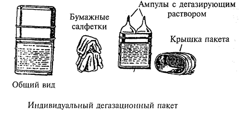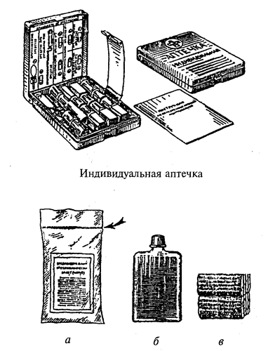 К медицинским средствам защиты относятся: аптечка индивидуальная, индивидуальный противохимический пакет, перевязочный пакет, дегазационный пакет. Аптечка индивидуальная (АИ-2) позволяет предотвратить развитие тяжелых последствий воздействия на человека некоторых поражающих факторов при ЧС. В ее состав входят радиозащитные, противорвотные, противобактериальные, противоболевые средства и антидоты. Необходимо твердо знать, как и когда использовать содержимое аптечки АИ-2. Применение шприц-тюбика предупредит развитие шока при переломах, обширных ожогах и ранах. Порядок укладки и инструкция по пользованию препаратами приложены к аптечке (рис. 7.7). Индивидуальный противохимический пакет ИПП-8А, ИПП-10А (см. рис. 7.7) применяется для обеззараживания капельно-жидких ОВ, попавших на кожу, одежду, обувь. Пакет содержит флакон с дегазирующим раствором, ватно-марлевые тампоны, инструкцию для пользования и герметичную упаковку. Пакет перевязочный индивидуальный состоит из бинта (ширина 10 см, длина 7 м), двух ватно-марлевых подушечек (для наложения на раны, одна из них подвижная, чтобы наложить на сквозное грудное ранение), булавки для закрепления повязки и правил пользования пакетом. Свернутые подушечки и бинт завернуты в пергаментную бумагу. Бинт, подушечки и внутренняя поверхность упаковки стерильны и могут быть использованы при наложении повязок: к этим поверхностям нельзя прикасаться руками.