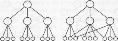 а) б) Рисунок 3.1.2 Иерархические структуры с сильными (а) и слабыми (б) связями В виде иерархических структур представляются конструкции сложных технических изделий и комплексов, структуры классификаторов и словарей, структуры целей и функций, производственные структуры, организационные структуры предприятий. Структуры систем можно представлять не только в графическом виде, но и, в частности, в табличном (матричном), что позволяет представлять взаимоотношения менаду уровнями иерархической структуры. Иерархическая структура с сильными связями может быть представленаматричной структурой (рис. 3.1.3. а и 3.1.3. б). Такое представление иногда, удобнее на практике, например при оформлении планов, когда нужно указать исполнителей, сроки выполнения, формы отчетности и другие сведения, необходимые для контроля выполнения плана.