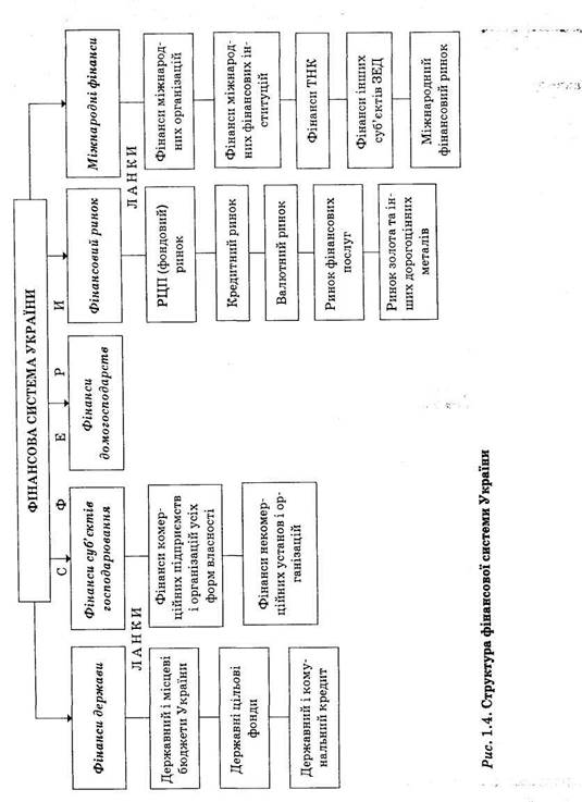 Термін "система" (з грец. — "поєднання", "утворення") найчастіше трактується як сукупність визначених елементів, між якими є закономірний зв'язок чи взаємодія. За внутрішньою будовою фінансова система — сукупність відокремлених, але взаємопов'язаних сфер (узагальнена за певною ознакою складова) та ланок (відособлена складова) фінансових відносин, які мають певні особливості в мобілізації та використанні фінансових ресурсів, а також відповідний апарат управління та нормативно-правове забезпечення. Найчастіше фінансову систему структурують за: - формами власності (рис. 1.1); - основними суб'єктами фінансових відносин (рис. 1.2); - рівнями економічної системи (рис.1.3). - сферами фінансових відносин (рис.1.4)