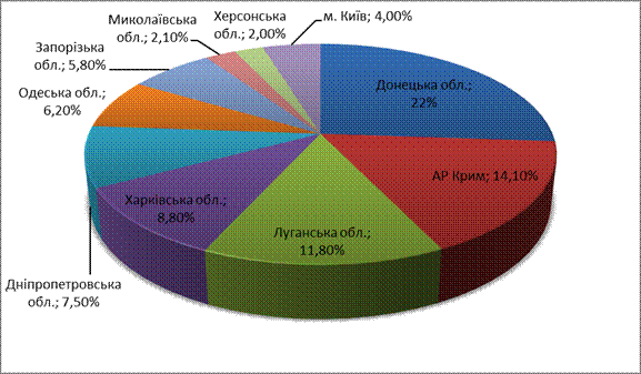 Діаграма 2. Білоруси. Це - третя за кількістю громадян меншина в Україні. Її чисельність постійно зростає. В 2001 р. їх кількість становила понад 275.8 тис. Близько 80 % з них проживало в міських поселеннях. Білоруси з давніх-давен селилися в Україні, спочатку - в її північних районах, а в XVIII-XIX ст. - на сході та півдні. Багато з них тепер проживає на сході та на півдні України (Донецька, Луганська, Харківська, Одеська, Миколаївська, Херсонська, Дніпропетровська області та АР Крим). Тут відсоток білорусів від їх загальної кількості в країні коливається від 16.1% (Донецька обл.) до 2.9% (Херсонська обл.). Майже 70% білорусів проживає у сільській місцевості Рівненської області. Молдавани. В Україні проживає 258.6 тис. молдаван. Чимало їх осіло тут у XVI-XVII ст., коли молдавські кріпаки, рятуючись від турецького гноблення, цілими сім’ями переселялись в Україну. За післявоєнний період їх чисельність в Україні постійно зростає. За даними перепису населення 2001 року, понад 70% їх проживало на території Одеської та Чернівецької областей, значно менше - в Донецькій, Кіровоградській, Дніпропетровській, Луганській областях та в АР Крим. Понад 6% молдаван проживало в Херсонській, Харківській, Запорізькій та Вінницькій областях та в м. Києві. Особливістю сучасного розселення молдаван в Україні є те, що в переважній більшості представники названої національної меншини проживають у сільській місцевості, найбільші в Одеській та Чернівецькій, значна кількість - у селах Кіровоградської, Харківської, Миколаївської, Полтавської, Херсонської, Черкаської областей. Тільки в таких індустріальних областях як Дніпропетровська, Донецька, Луганська, Запорізька та АР Крим більшість молдаван проживає в міських поселеннях. Болгари (204.6 тис. осіб) проживають в Україні в переважній більшості (87.1%) компактно на території Одеської і Запорізької областей. В незначній кількості вони є і в Донецькій, Миколаївській, Кіровоградській, Дніпропетровській, Луганській областях. Болгарські колонії з’явились на півдні України в другій половині XVIII ст. під час боснійсько-турецької війни. Болгари в Україні - переважно сільські жителі. Як і інші національні меншини, вони користуються всіма правами, гарантованими їм Конституцією України. Болгарською мовою видаються газети, ведеться радіомовлення, підготовка вчителів тощо. Поляки - одна з найдавніших національних меншин України. Вони селилися на українських землях ще з княжих часів. Друга хвиля припливу поляків в Україну почалася після розпаду Галицько-Волинської держави та окупації Польщею Галичини, Західного Поділля. Колонізація поляками Лівобережної України розпочалася наприкінці XVI - на початку XVII ст. В 20-х роках XX ст. у зв’язку з жовтневим переворотом та громадянською війною багато поляків, особливо великих землевласників та інтелігентів, повернулися до відродженої Польської держави. Чимало їх виїхало з України після Другої світової війни внаслідок репатріації з західноукраїнських земель. За переписом населення 2001 року в Україні проживало 144.1 тис. поляків. Із післявоєнних переписів населення видно, що їх загальна чисельність в Україні постійно скорочується. Особливістю сучасного розселення поляків в Україні є те, що найбільше їх проживає в областях давньої осілості - на Волині, Поділлі, в Галичині, зокрема в Житомирській, Хмельницькій, Льв