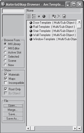 В счетчике Overall (Общие) задается общая высота подъема. Параметр Riser Ht (Высота подъема) определяет высоту ступеньки, а счетчик Riser Ct (Количество ступеней в общей высоте подъема) – количество ступенек. Параметры ступеней указываются в области Steps (Ступени). Счетчик Thickness (Толщина) отвечает за толщину ступеньки, счетчик Depth (Глубина) – за глубину. Для архитектурных объектов в 3ds Max предназначены специальные шаблоны материалов Aec Templates (Библиотека шаблонов), которые выделены в одноименную библиотеку материалов (рис. 9.8).