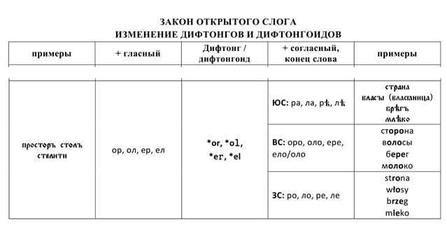 Полезные заметки для выполнения контрольной работы Напишу вам коротко те фонетические процессы, которые могут встретиться в словах контрольной работы. А их всего 12: два из праславянского периода и десять из древнерусского. Но первоначально небольшая заметка о том, как различить гласные переднего ряда от гласных непереднего ряда. Я их различать научилась так: гласные переднего ряда – это те, которые смягчают согласные, а именно: И, Я, Е, Ѣ, Ь. Гласные непереднего ряда – это те, которые не смягчают согласные, а именно: А, О, У, Ы, Ъ. Евгения Александровна говорит, что такое различение неправильное, однако если вы откроете таблицу гласных, то они там будут обозначены именно так! В любом случае, [во избежание чрезвычайных ситуаций и террористических актов] я советую вам не говорить преподавателям про «гласные, которые (не) смягчают согласные». Фонетические процессы праславянского периода – это палатация и монофтонгизация. Сперва о палатации. Палатаций всего было три. В палатации участвуют три звука: Г, К и Х (заднеязычные). Первая палатация – это когда эти самые заднеязычные оказываются в позиции перед j или гласным переднего ряда. В такой позиции они превращаются в: Г → Жʹ, К → Чʹ, Х → Шʹ. Короче говоря, если в слове буквы Ж, Ч и Ш стоят перед гласной переднего ряда (например, ДРОУ ЖИ ТИ, ВЛЪ ЧИ И, ДОУ ШИ ТИ), то это – первая палатация. Вторая палатация – это когда заднеязычные оказываются в позиции именно перед буквами И или Ѣ. В такой позиции они превращаются в: Г → Зʹ, К → Цʹ, Х → Сʹ. То есть, если в слове буквы З, Ц и С стоят перед буквой И или Ѣ (например, ДРОУ ЗИ, ВЛЪ ЦИ, МОНА СИ), то это – вторая палатация. Третья палатация – это, наоборот, когда заднеязычные оказываются в позиции ПОСЛЕ гласных переднего ряда. В такой позиции они, как и во вторую палатацию, превращаются в:: Г → Зʹ, К → Цʹ, Х → Сʹ. То есть, если в слове гласная переднего ряда стоит ПЕРЕД буквами З, Ц и С (например, КЪН ѦЗ Ь, СТАР ЬЦ Ь, В ЬС Ь), то это – третья палатация. Замечу, что чаще всего в контрольной встречаются первая и третья палатации. Вторая встречается реже. Теперь о монофтонгизации. Монофтонгизация – это когда дифтонг (то есть сочетание двух гласных) или дифтонгоид (сочетание гласной и согласной) из сочетания двух звуков превращается в один звук при условии нахождения его (дифтонга или дифтонгоида) перед гласным или перед согласным. Например, дифтонг *ai, находясь перед гласным, превратился в звук [aj], а находясь перед согласным, трансформировался в Ѣ. Ниже даю вам таблицу изменений всех дифтонгов и дифтонгоидов.