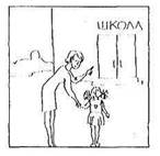 Назначение. Определение мотивов к учению. Стимульный материал. Семь карт со схематическим изображением фигур. На одной стороне карты изображен вариант для мальчиков, на другой – для девочек. Карта 1. На улице женская фигура, несколько склоненная в сторону мальчика (девочки) с указывающим в направлении школы жестом. У ребенка ранец за спиной. Видно здание школы с вывеской «Школа» (внешний мотив). Рис. 1 (а, б)