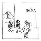 Карта 4. На улице две фигуры двигаются по направлению к школе. Взрослый мужчина изображен с портфелем. Рядом мальчик (девочка) с ранцем. Видна четко написанная вывеска «Школа» (мотив взрослости). Рис. 4 (а, б)