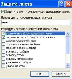 Excel позволяет защитить отдельные ячейки, листы, книги. Для защиты листов и книг необходимо выполнить следующие действия: 1. Перейти на вкладку Рецензирование. 2. В группе Изменения выберете в зависимости от задачи Защитить лист или Защитить книгу. 3. В появившемся окне диалога выберете необходимые параметры защиты и нажмите кнопку ОК.