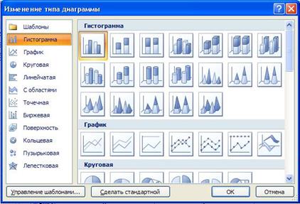 Рис.9.2 Для того, чтобы один из специальных типов диаграмм или разработанный пользователем шаблон включить в меню стандартных типов, нужно в окне Изменение типа диаграммы после выбора необходимого типа нажать кнопку Сделать стандартной. Чтобы включить в список типов диаграмм собственный шаблон, необходимо щёлкнуть на кнопке Управление шаблонами, где в новом окне можно выбрать необходимый шаблон.